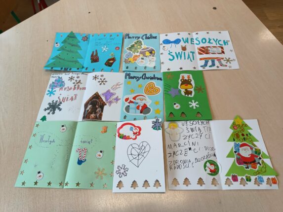 Podczas zajęć plastyki klasa IV A wykonała własnoręcznie piękne kartki świąteczne. Każda kartka jest wyjątkowa i powstała z dużym zaangażowaniem oraz kreatywnością uczniów. Prace przedstawiają świąteczne motywy i zostały przygotowane z myślą o zbliżających się świętach. Kartki będzie można kupić na szkolnym kiermaszu świątecznym.