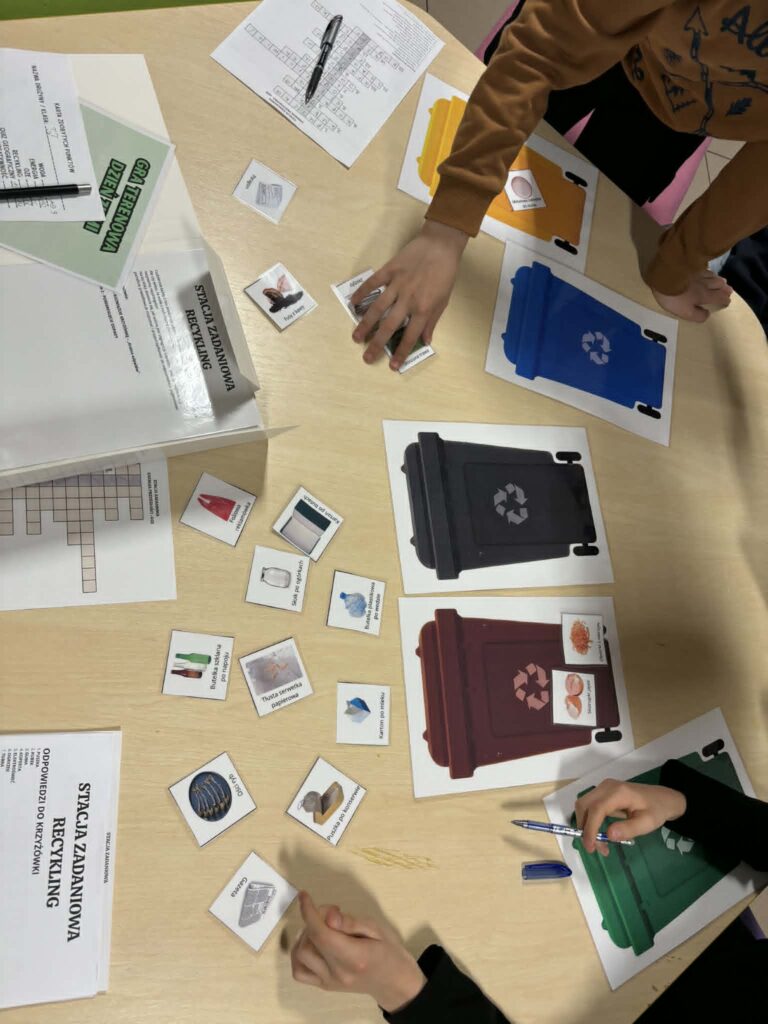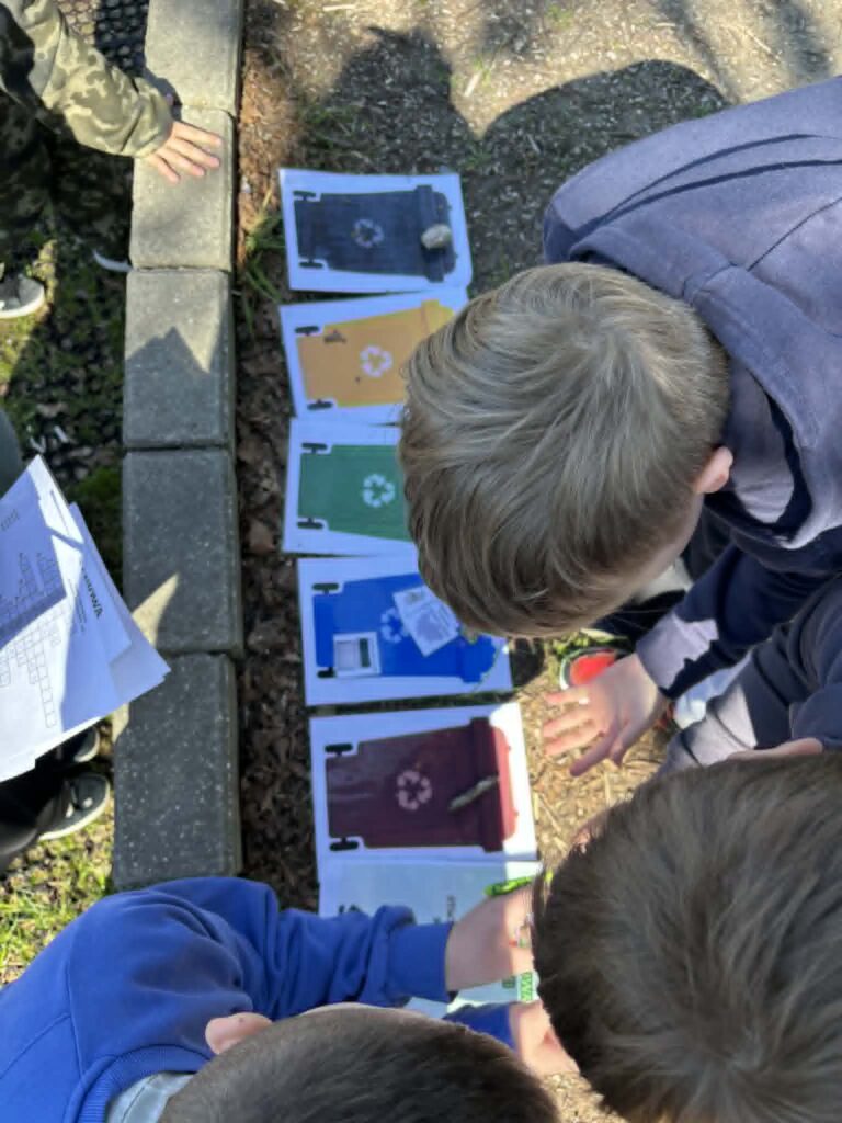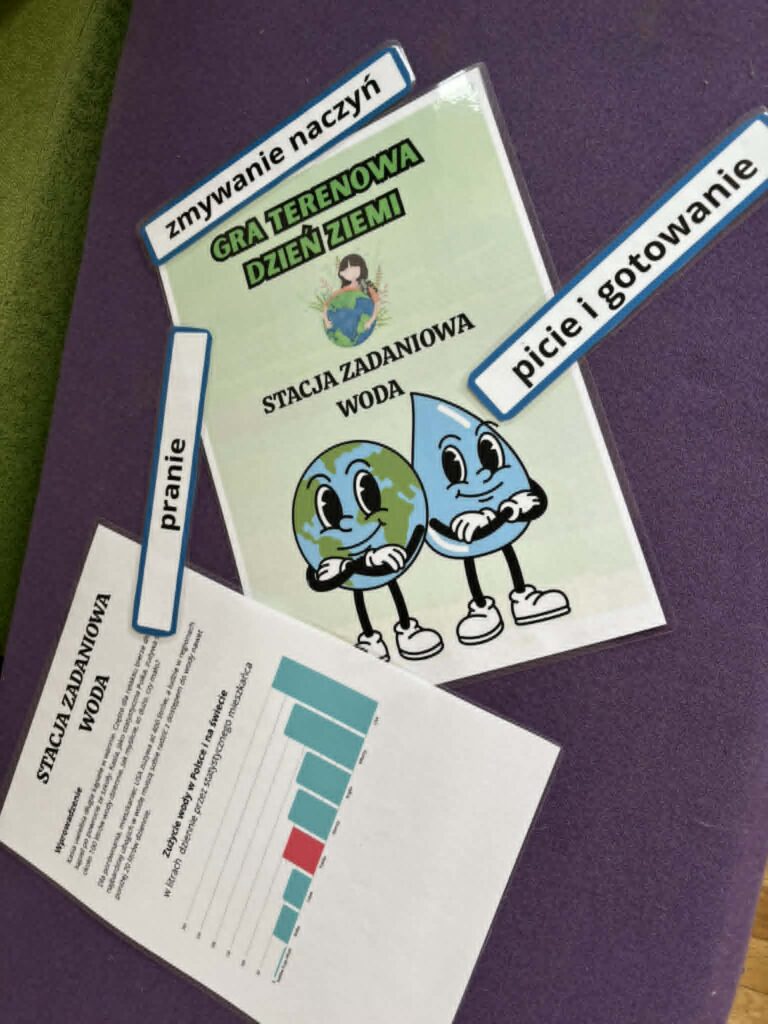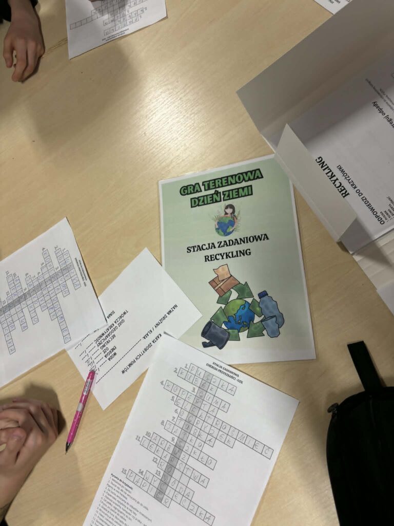 W dniach 20–24 kwietnia w naszej szkole odbyła się gra terenowa dla uczniów klas 5–6 z okazji Dnia Ziemi. Była to wyjątkowa inicjatywa, która połączyła naukę z aktywnością ruchową, współpracą i dobrą zabawą. Na uczestników czekały różnorodne stacje zadaniowe. Uczniowie mierzyli się m.in. z zadaniami dotyczącymi recyklingu – rozwiązywali krzyżówki oraz segregowali odpady do odpowiednich pojemników. Na kolejnych stanowiskach sprawdzali swoją wiedzę w quizie geograficznym, poznawali zagadnienia związane z wodą i jej zużyciem w codziennych czynnościach, a także zgłębiali temat energii przyszłości i odnawialnych źródeł energii poprzez interaktywne quizy. Uczniowie pracowali w zespołach, przemieszczając się między stacjami i wspólnie rozwiązując przygotowane zadania. Taka forma pracy sprzyjała integracji oraz rozwijaniu umiejętności współpracy w grupie. Głównym celem gry było rozwijanie świadomości ekologicznej uczniów, utrwalenie wiedzy geograficznej oraz pokazanie, że nauka może być ciekawa i angażująca. Wydarzenie spotkało się z dużym zainteresowaniem i zaangażowaniem uczestników, a zdobyta wiedza z pewnością przyczyni się do bardziej świadomego dbania o środowisko naturalne.