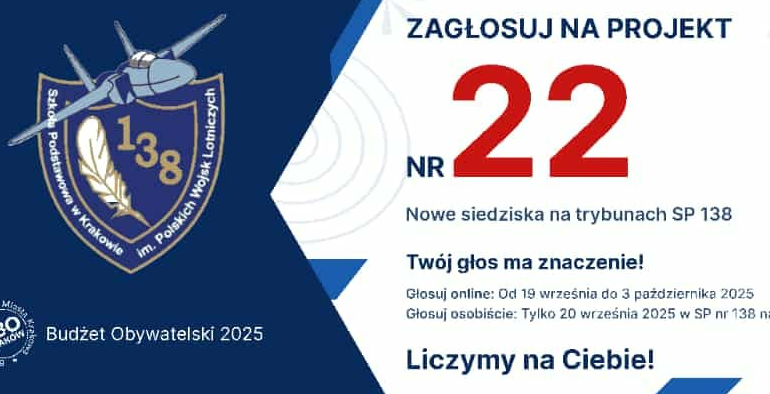 Budżet Obywatelski Miasta Krakowa 2025 SP 138 walczy o nową trybunę! Głosowanie: 19 września – 3 października 2025 Projekt: „Wymiana siedzisk na trybunie boiska szkolnego w SP 138” Nr projektu: 22 (Dzielnica VI) Oddaj głos online: budzet.krakow.pl/projekty2025/8828wymiana_siedzisk_na_trybunie_boiska_szkolnego_w_sp_138.html Razem możemy więcej – Twoje kliknięcie to bezpieczne i nowoczesne trybuny dla uczniów i mieszkańców! Głosuj i wspieraj […]